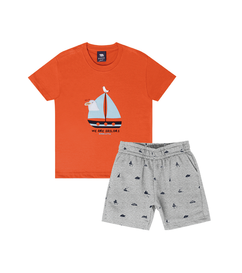 CONJUNTO DA MARCA BIOGÁS, CAMISETA EM MEIAMALHA P.A JET COM ESTAMPA E TERMOCOLANTE.BERMUDA MALHARIA CONJUNTO COM ESTAMPA FULL PRINT BARCOS MARINHA + BOLSO FACA.